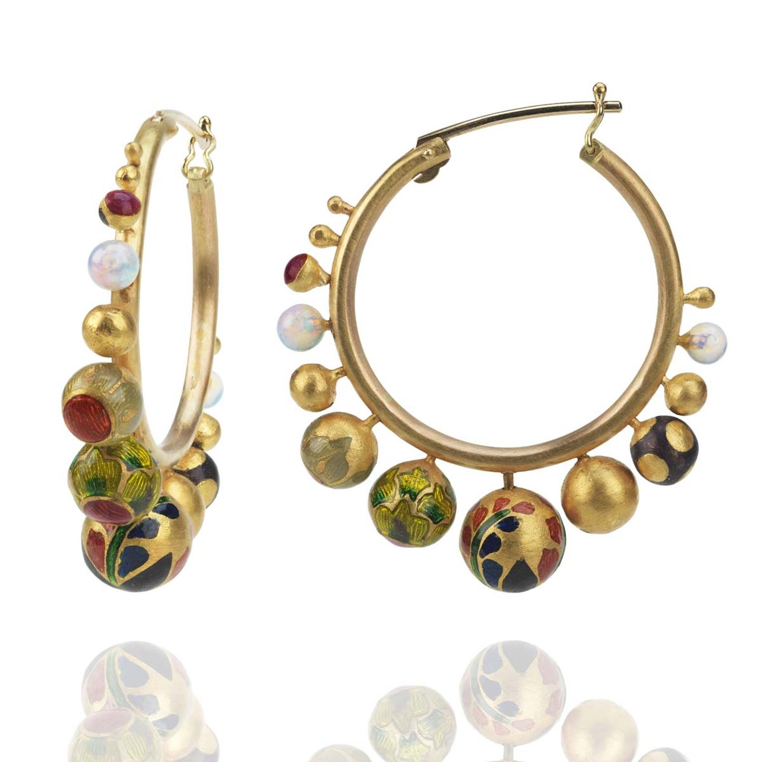 Alice Cicolini Kimono Hoop earrings in yellow gold with white opals and vitreous enamel spheres.