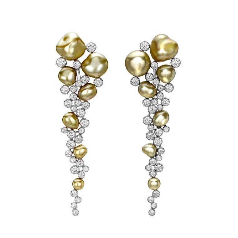 Mikimoto Regalia Collection Gold Cascade earrings with gold pearls and diamonds in white gold.