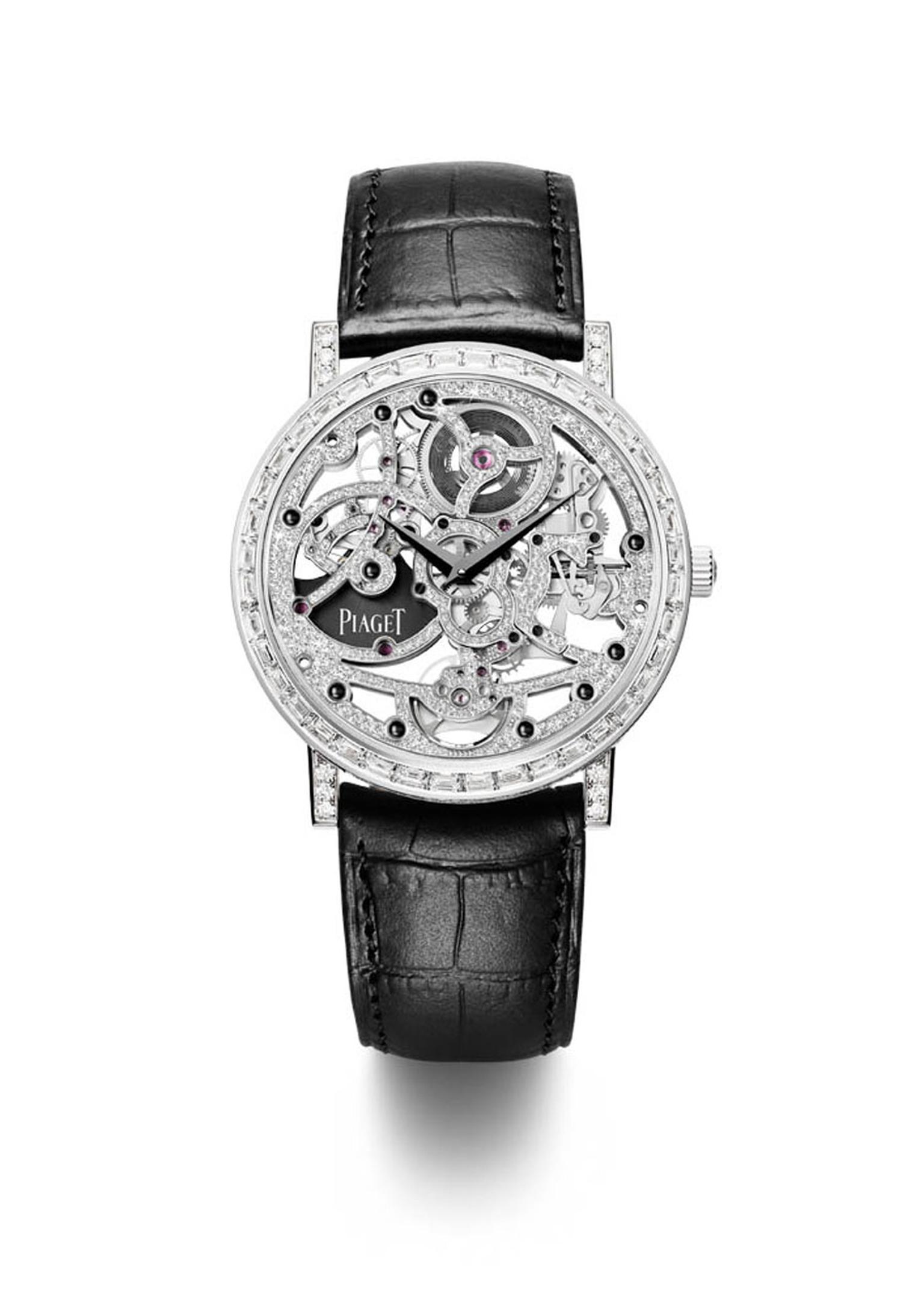 The Piaget Altiplano automatic Gem-Set Skeleton watch in white gold is the world's thinnest skeleton model at just 6.10mm thick. The bezel is set with 40 baguette-cut diamonds, while the rest of the watch is set with 347 brilliant-cut diamonds.