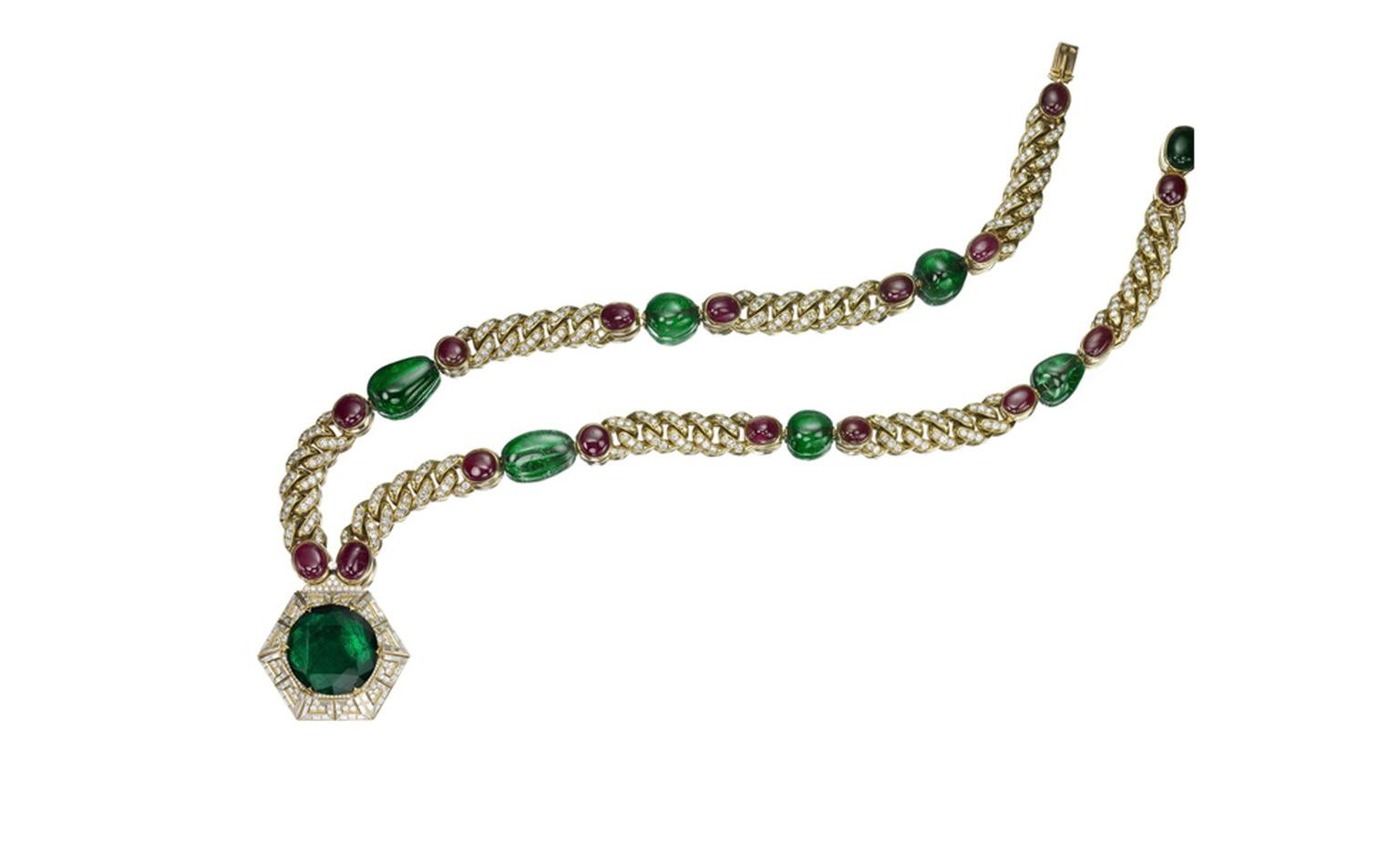 An emerald, ruby and diamond sautoir suspending an hexagonal-shaped emerald of 44.90 carats, by Bulgari, 1970s. Estimate: Sfr. 235,000 – 320,000 (US$ 260,000 – 360,000)