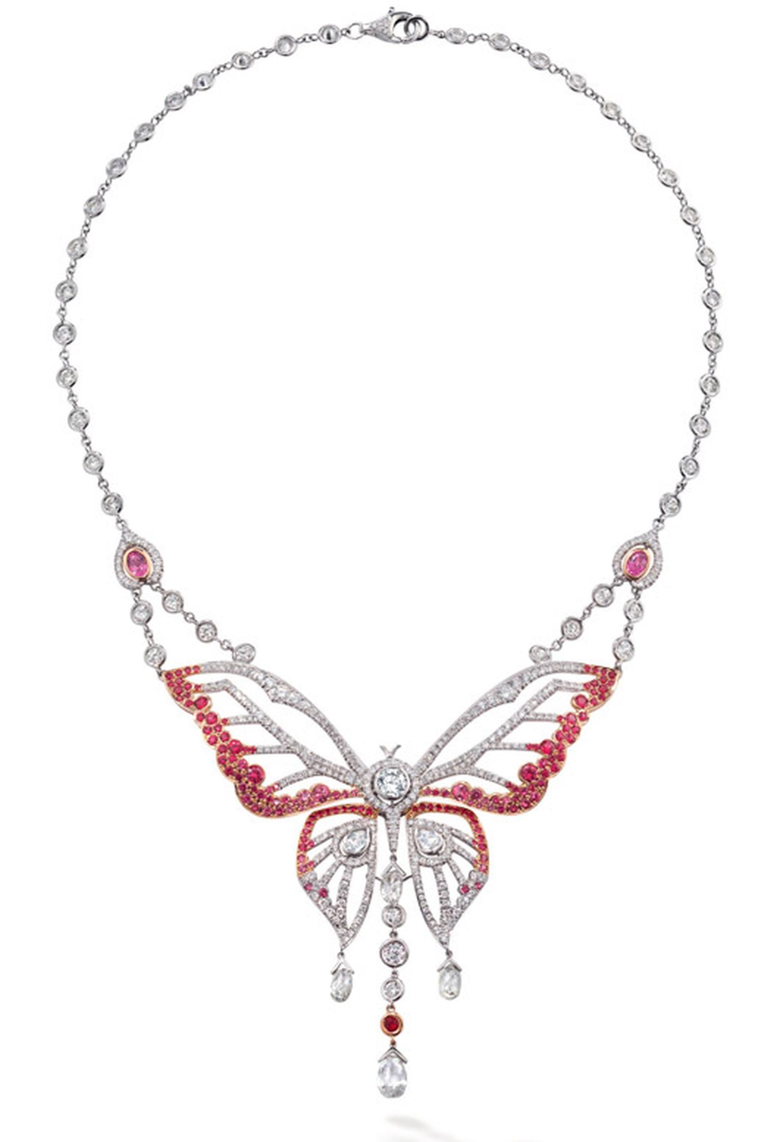 Boodles Papillon necklace with a butterfly centre piece with pierced wings comprised of pink spinels with pear shape and briolette cut diamonds. Mounted in platinum and 18ct rose gold and with an 18ct white gold clasp. Diamonds total 7.83cts, spinels 3.26cts. £75,000
