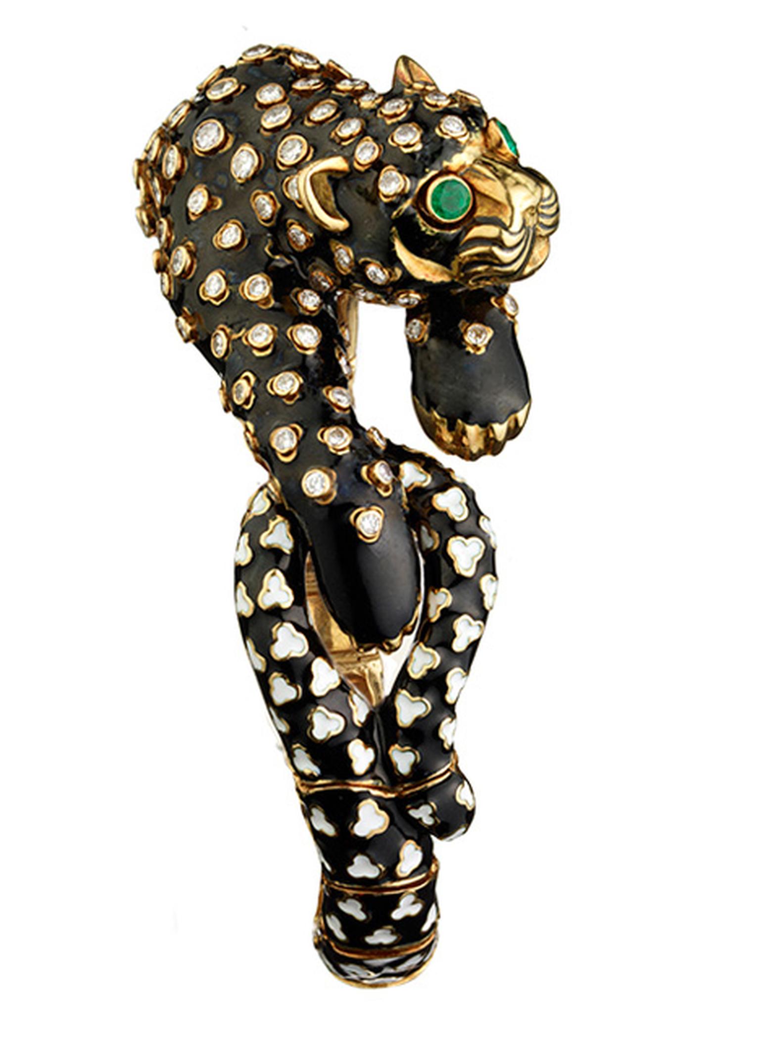 David Webb gold and black enamel Leopard bracelet with cabochon emeralds and diamonds.