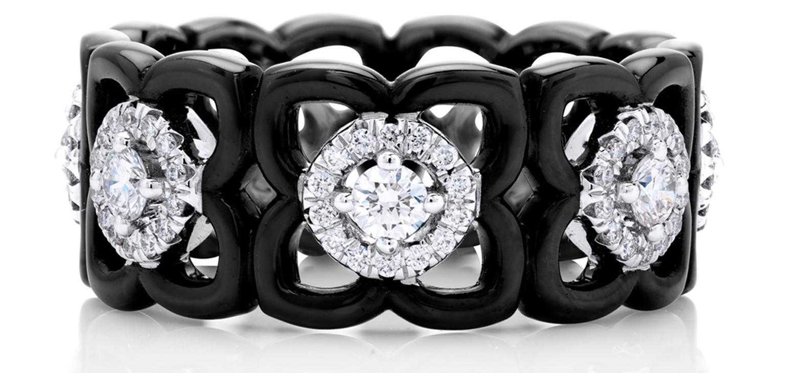 De Beers 'Moonlight Lotus' band with white diamonds, set in white gold and black ceramic (£3,650).