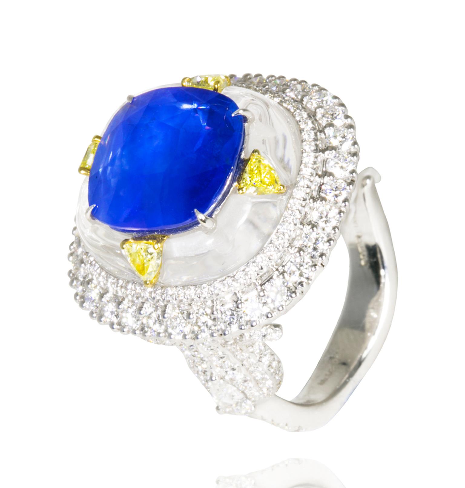 For a mere £94,800, you can own the Amrapali diamond ring featuring a centre sapphire set into rock crystal and surrounded with four yellow diamonds which are further outlined by a plethora of white diamonds.