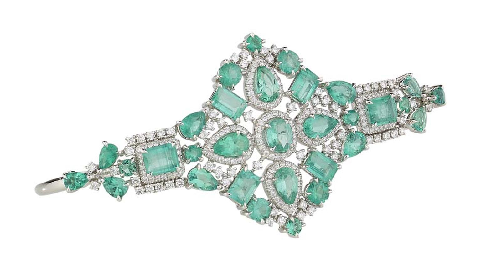Embellished with emeralds and diamonds, this Gaydamak hand bracelet will brighten any hand.