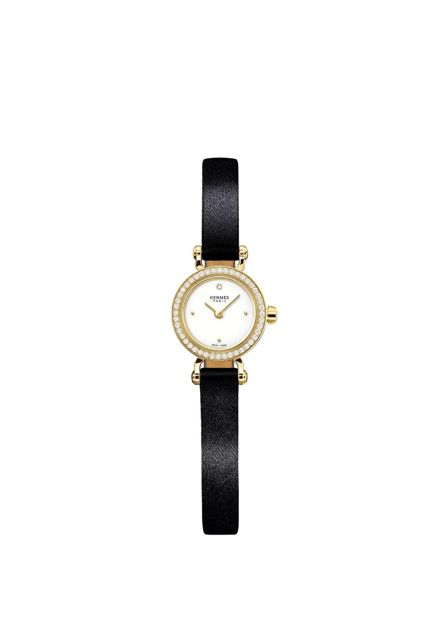 Hermès Faubourg watch with a yellow gold case and black satin strap.