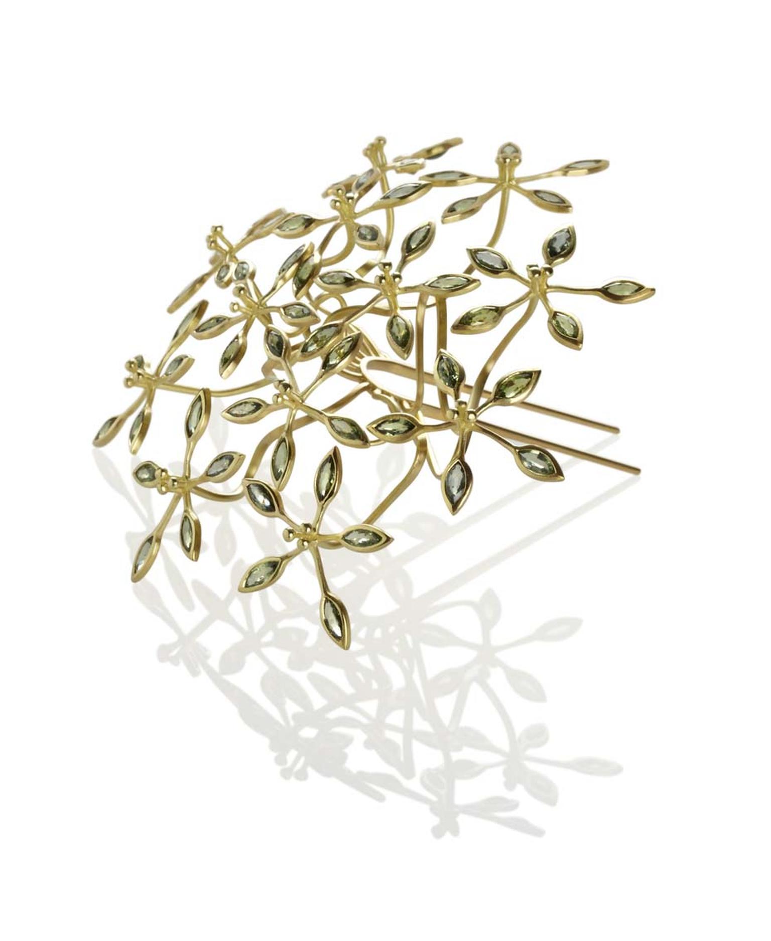 Jo Thorne Passion Flower hairpin in yellow gold set with 60 rare green sapphires (£25,000).