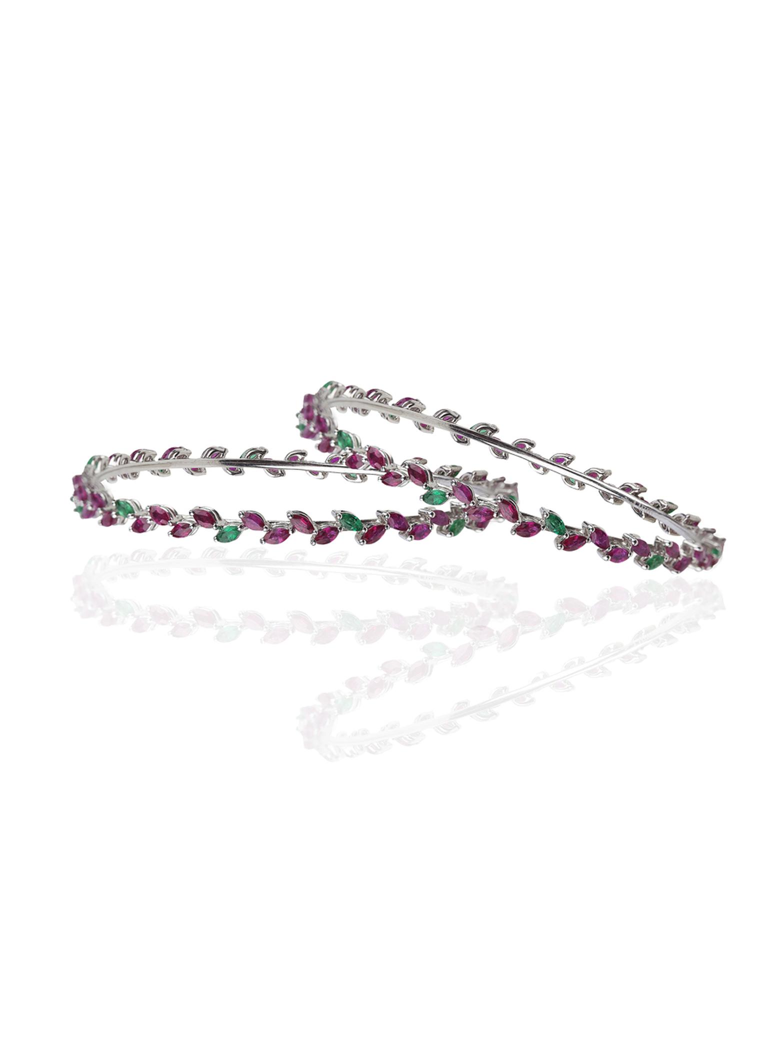 Mirari white gold bangles featuring marquise cut rubies and emeralds.