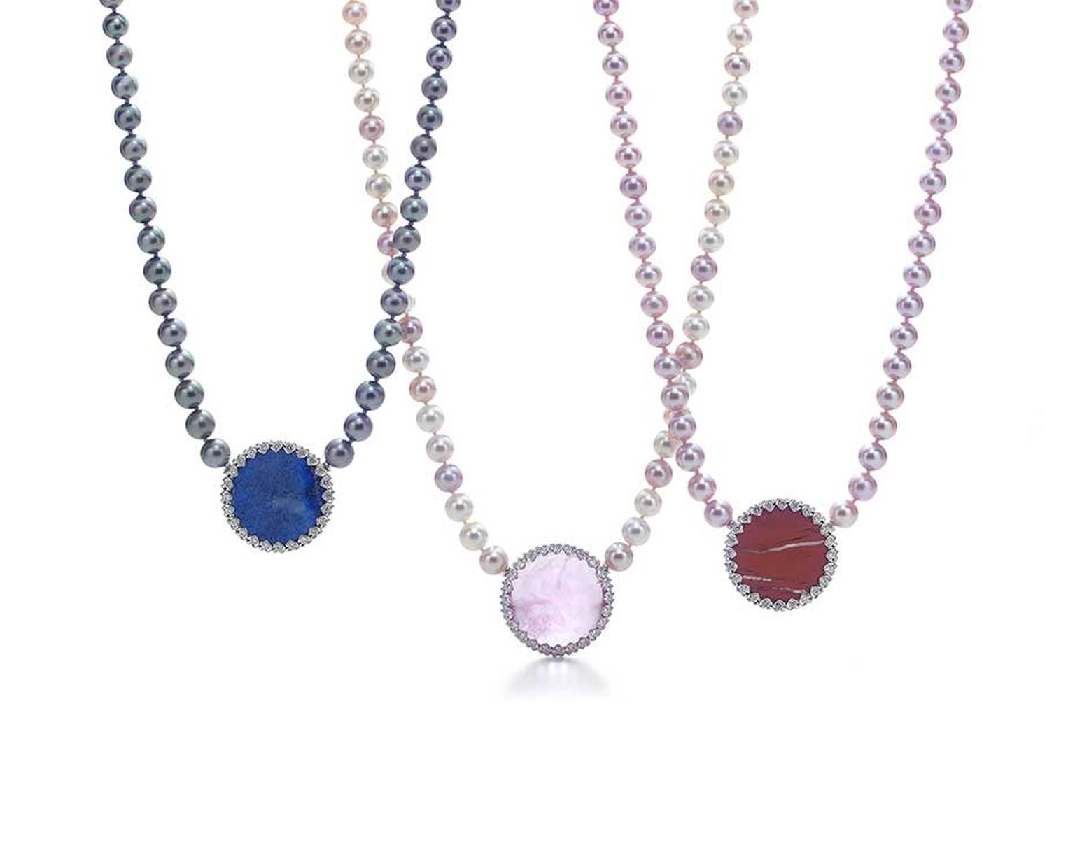 Tiffany & Co. Paloma Picasso Crown of Hearts necklaces with various stones surrounded by pave diamonds and a pearl chain.