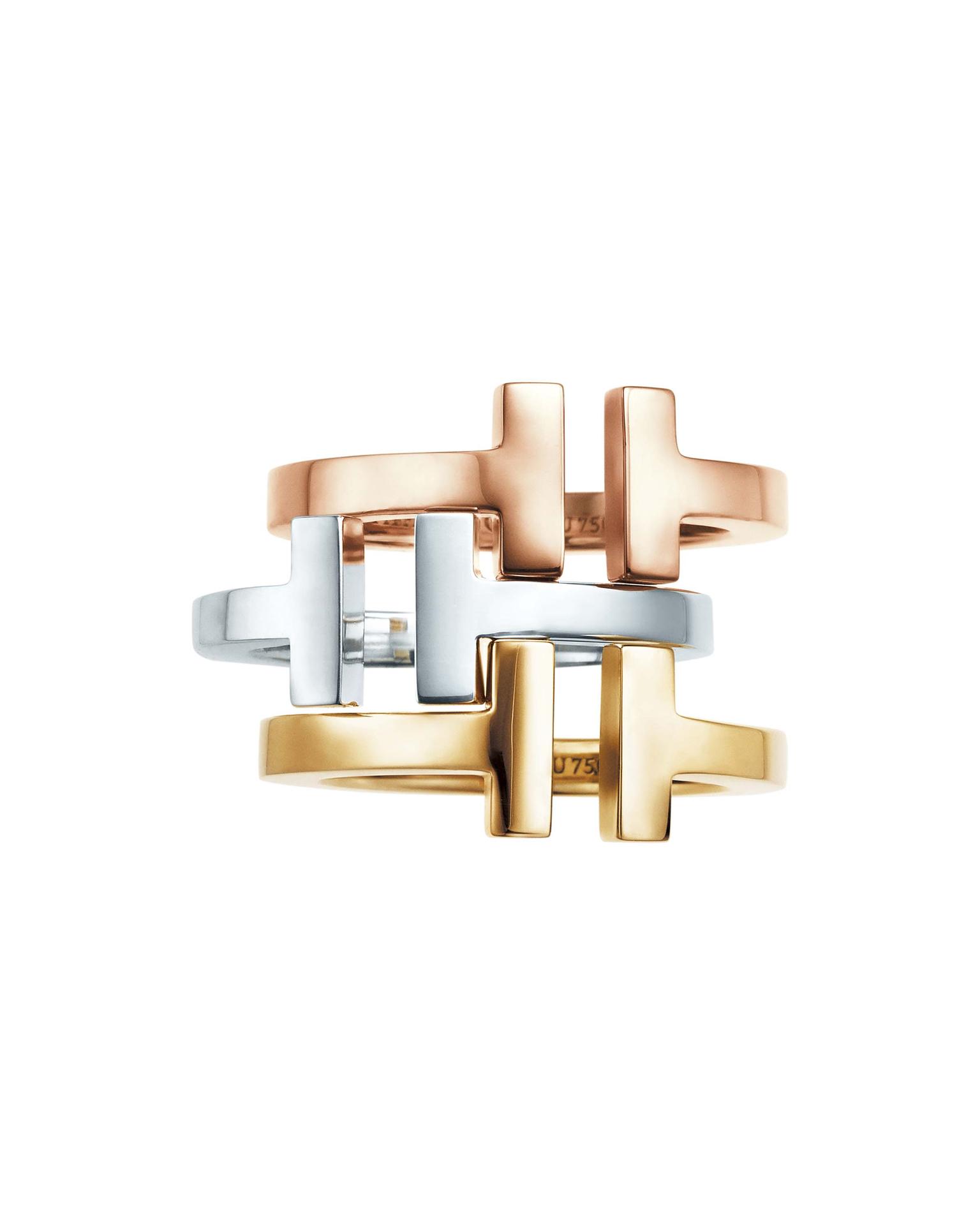 Tiffany T square rings in rose and yellow gold from £975 and silver from £300.