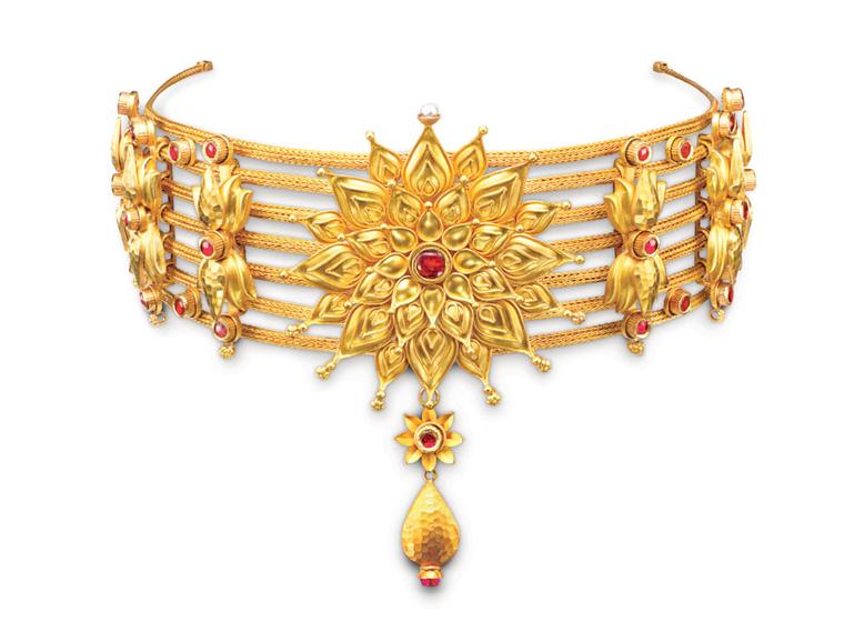 The ornate, beautifully articulated collection includes seven-row haars, necklace sets and pendants, all crafted from 22ct gold. Seamlessly blending traditional Indian jewellery-making techniques such as gold granulation, stamping and filigree with ornamentation in the form of gold chains, beads and coins, and accents of coloured stones and pearls, Tahiliani's fashion pedigree is translated into beautiful jewels that give off just the right degree of grandeur.