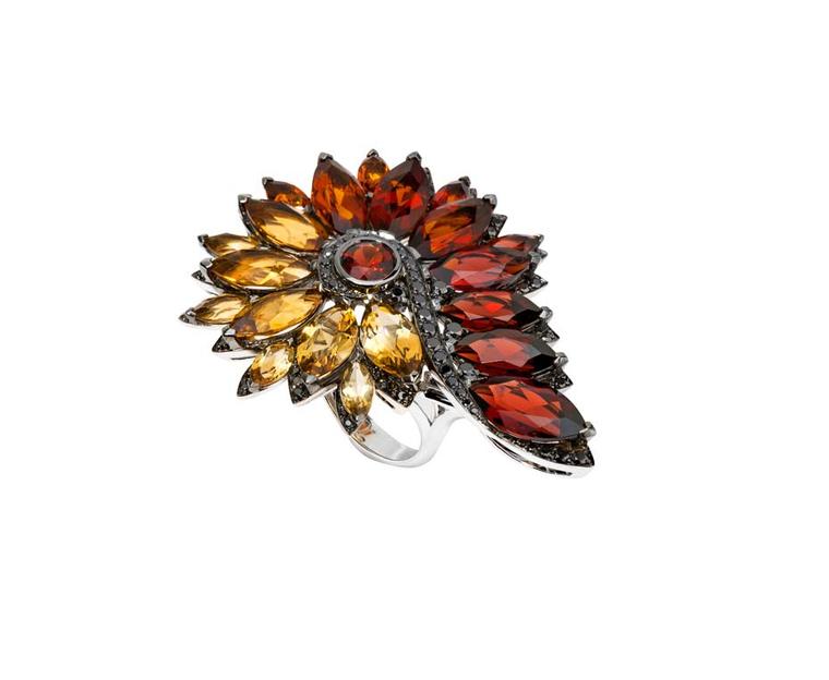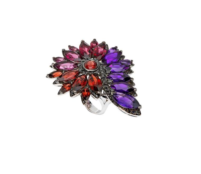 Magnipheasant has a pun in its very name, and Webster has chosen the colours of this most British of fowls to inspire the colourful jewellery set. The bird's iridescent plumage is captured in red garnets, pink tourmalines, amethysts, blue topaz, peridots, citrines and black diamonds to dramatic effect.