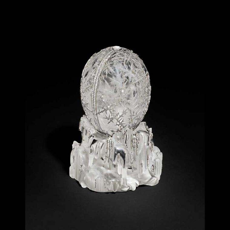 The Egg is carved from rock crystal and mounted with platinum and thousands of rose-cut diamonds that form a breathtakingly realistic pattern of snowflakes. Inside is a basket of platinum from which bloom wood anemones intricately carved from white quartz, symbolising the arrival of spring and rebirth after winter. Alma Theresia Pihl went on to become one of Fabergé's star designers behind the house's most remarkable eggs and in 1914 designed The Mosaic Egg which is now in The Royal Collection in the United Kingdom.