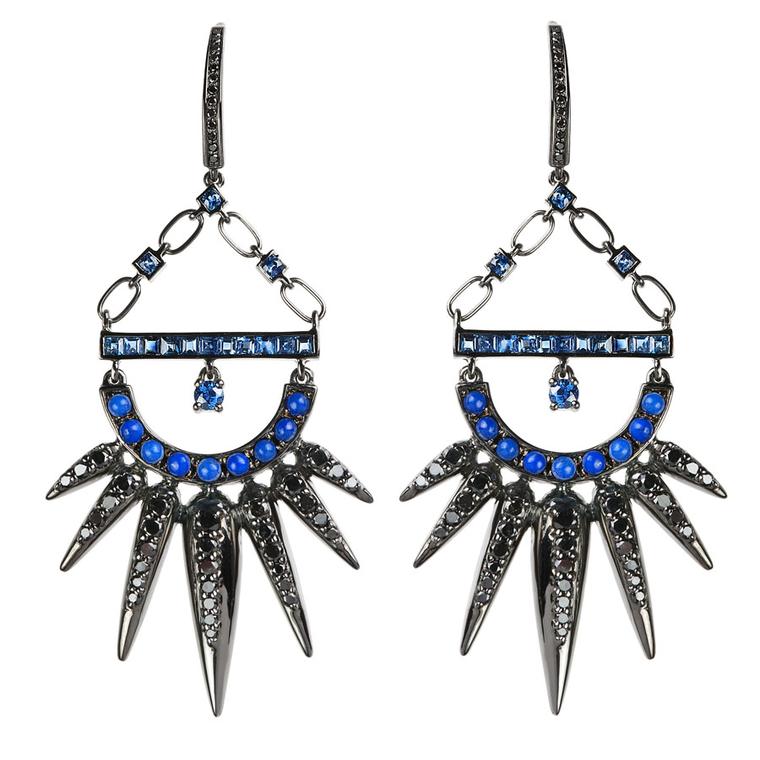 Mirroring the sun's rays, geometric spikes jut proudly upwards from colourful jewels - a sharp silhouette that repeats itself throughout the collection. Gem-set rhodium darts descend from the lobe in a pair of earrings, framing grey pearls, while rows of points top a circular rose gold ring set with brown diamonds, white diamonds and pink tourmalines. The dramatic composition is typical of Koulis, who has a passion for avant garde design and beautiful gemstones.