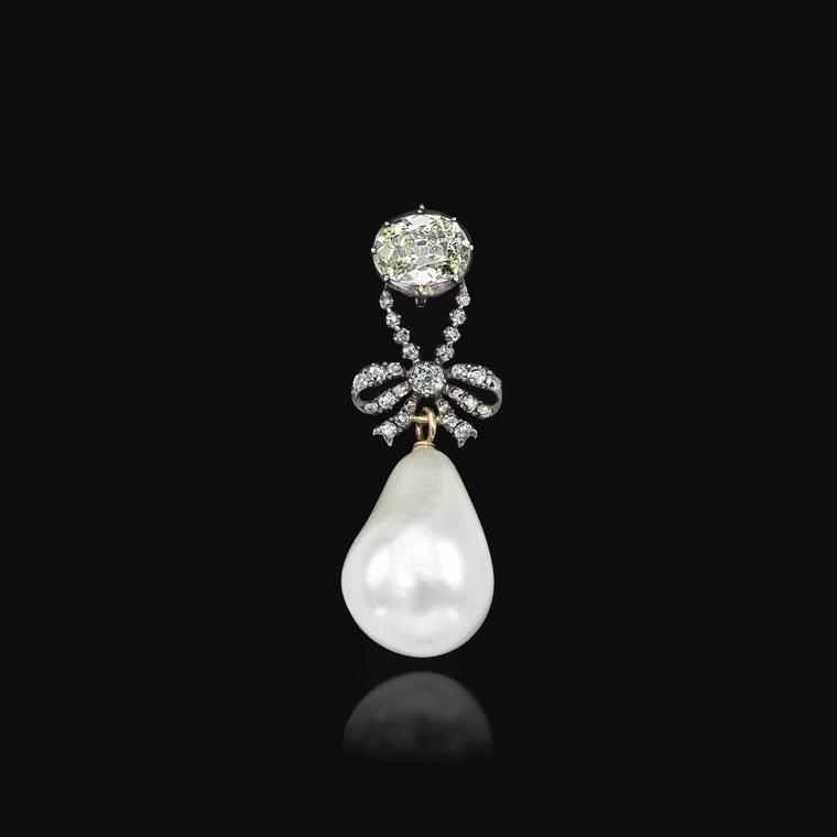 One of the survivors of the revolution is an enchanting baroque-shaped pearl and diamond bow pendant. Marie Antoinette wore it suspended from a three-strand pearl necklace with matching pearl earrings. Fortunately, it and other jewels were smuggled out of France via the Austrian ambassador and saved for her only surviving daughter Marie-Thérèse. The pendant later appeared in an auction alongside 10 other pieces from the queen’s personal collection and other French royal jewels owned by the Bourbon Parma family at Sotheby’s in 2018. With such enviable provenance the pendant sold for $36.2 million.