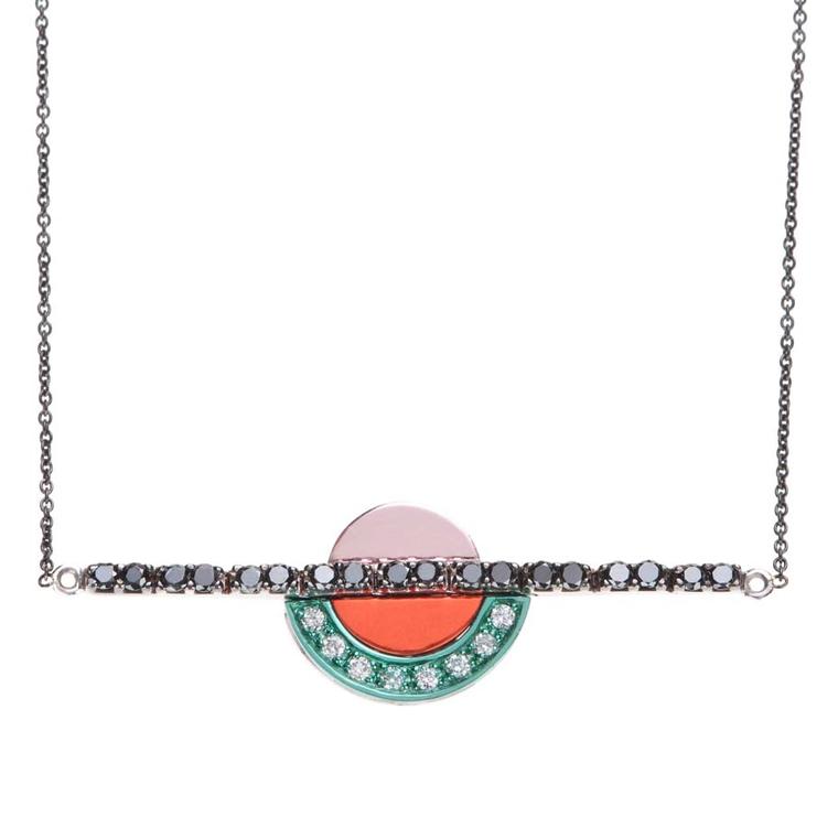 Nikos Koulis necklace, from the new Acrobat collection, in black rhodium, with white and black diamonds and white gold hand-painted in pink, orange and turquoise.