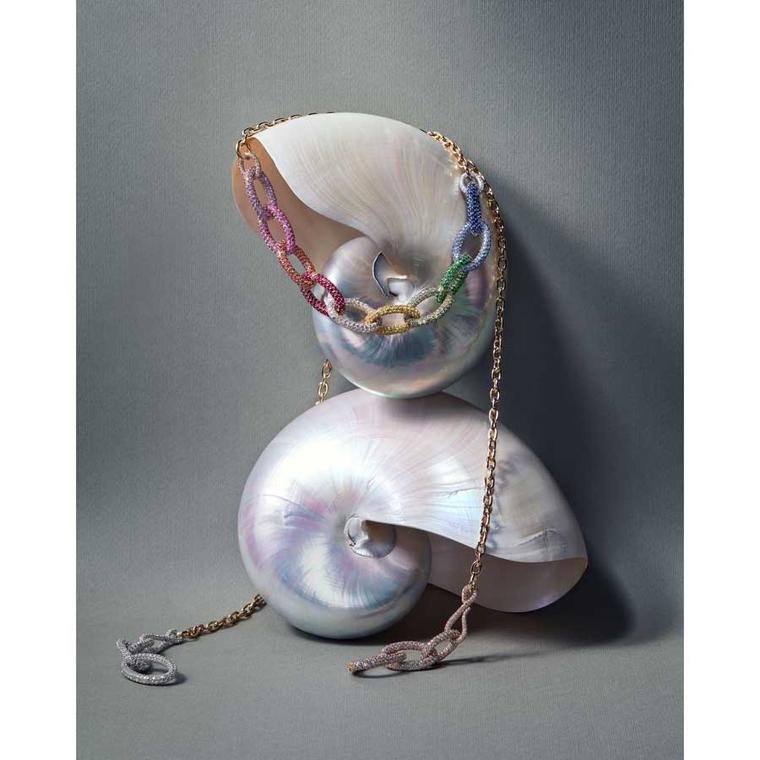 Clasps can be added to the chain to wear as a long necklace, a lariat, a choker, a bracelet or to add length to the earrings. For the daytime, just add one link to your necklace for a dash of glamour, for nighttime, all three clasps form a choker with the chain around the back of the neck. The clasps can added to the earrings or used as scarf rings. The round diamond-rope bracelet with its tapered hook clasp can be worn on the wrist or to add length to a necklace or even as a belt, and for the more fashion-forward, as shoulder-grazing earrings. The earrings become cufflinks and two bracelets make a luxurious all-diamond necklace, the list goes on and on. Bespoke pieces are included such as the Rainbow necklace with its dazzling colours.