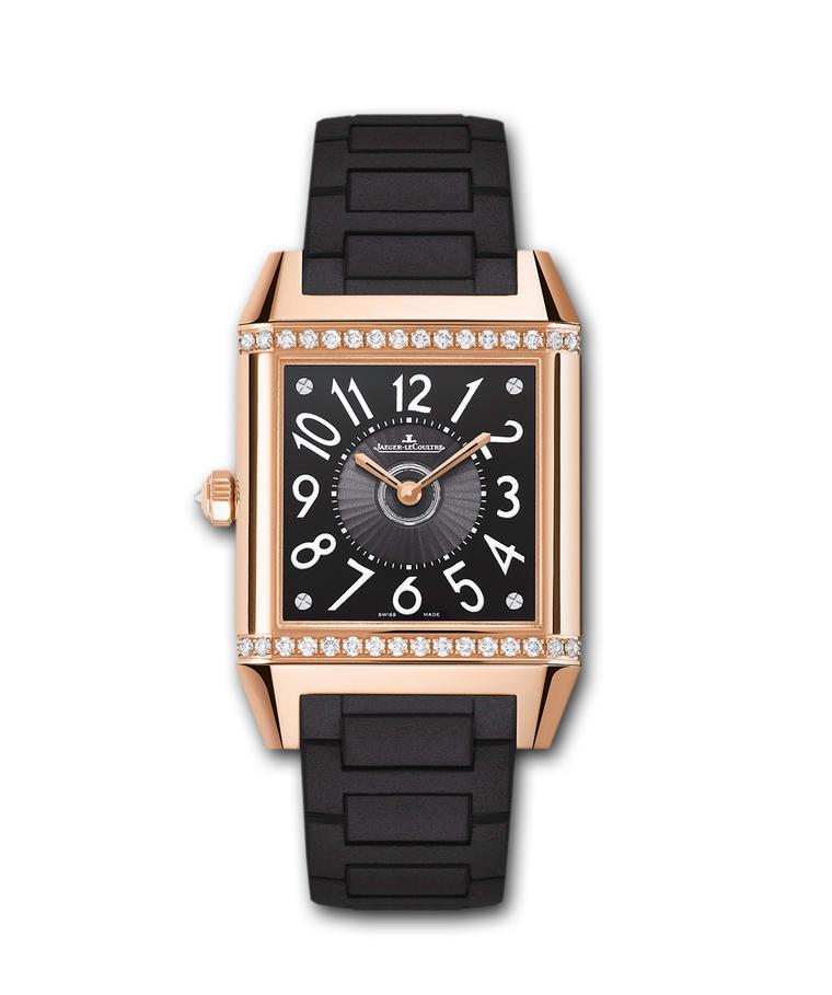 The redefined features of the Jaeger-LeCoultre Squadra watch lend it an elegant and feminine silhouette.Two watch faces with two completely different personalities, this Jaeger-LeCoultre Reverso Squadra Lady Duetto watch can reflect a woman's changing needs during her day. The rose gold Art Deco case measures 42 by 28.8mm and houses a square dial illuminated by a line of white diamonds above and below. The silvered guilloché sunray dial has Jaeger-LeCoultre's signature floral numerals circling a diamond-set track with a day/night dial decorated with a Sun and Moon pattern. The date aperture sits snugly within the 6 o'clock numeral. When the mood strikes, flip the dial over and a delightfully distinct dial is revealed. Dedicated solely to hour and minute functions, this black face features a visible central guilloché oscillating rotor. Both dials of this Duetto timepiece are powered by the same in-house mechanical movement, which provides a 42-hour power reserve. This Jaeger-LeCoultre Reverso Squadra watch is presented on a black rubber strap that features the Jaeger-LeCoultre quick-change system, allowing it to be replaced quickly and easily.