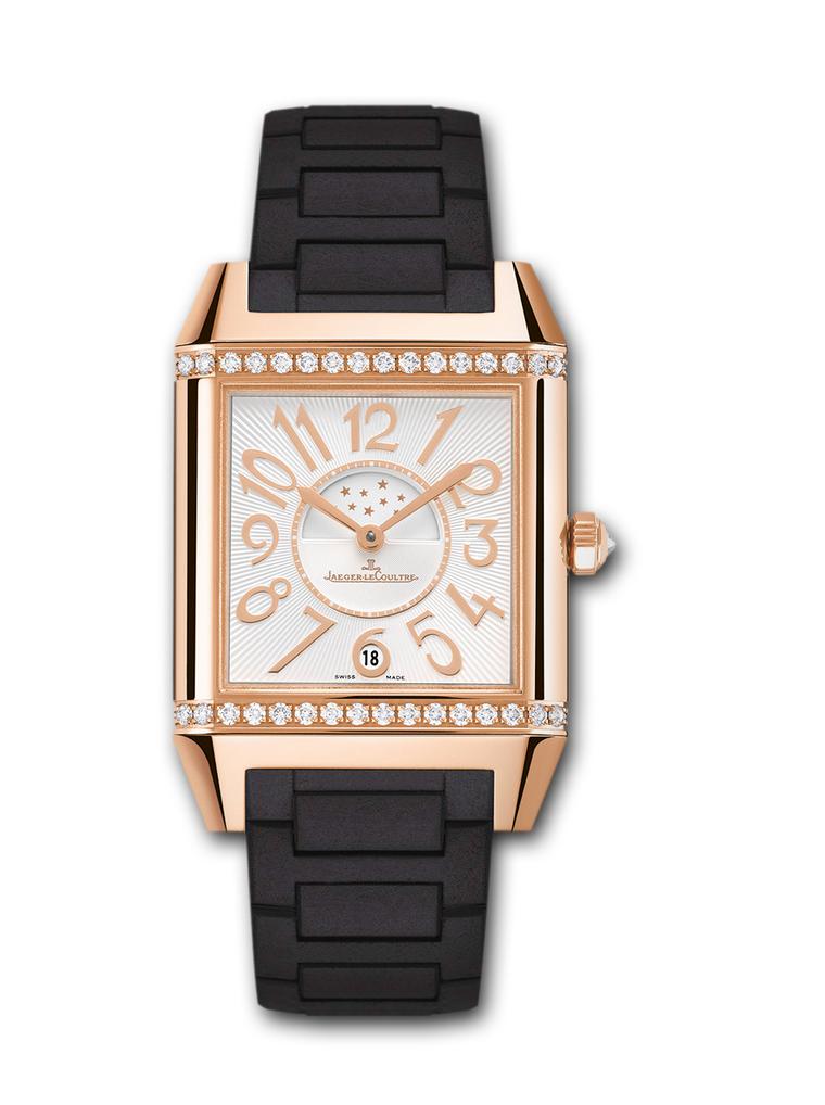 The Reverso Squadra Lady Duetto is just that: a square rendition of the classic rectangular Reverso. As with all Reversos, the Squadra has multiple personalities and invites you to swivel the case according to your mood. The front dial of the beautiful pink gold model features a diamond-set bezel, a silver guillochéd dial, golden numerals, a date display and a day/night indicator, while the back in black indicates that it's time to get dressed up and enjoy your evening.
