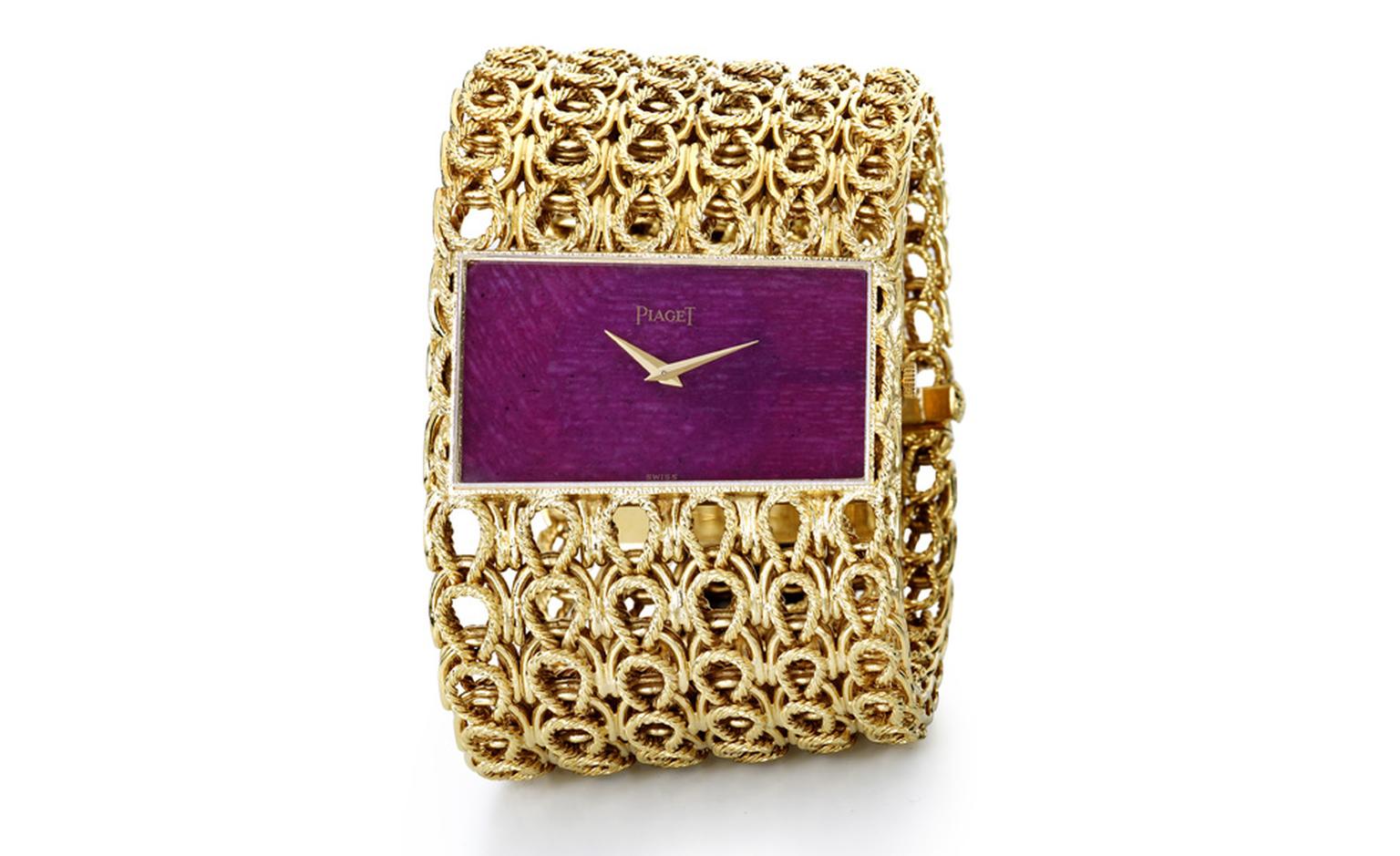 A visit to Piaget's HQ in Geneva revealed a gem of a museum showcasing the house's creative genius from the 1960's and 70's when coloured stone dials rocked and big gold "Esclave' cuffs were cool. The swinging Sixties and groovy Seventies are remembered for their audacious excess and Piaget certainly didn't hold back when it came to creating way-out jewellery watches. Semi-precious stone dials were introduced in 1964 unleashing a torrent of creativity from wide woven-gold cuffs - some complete with fringes - and oozing, writhing shapes that capture the vibe of the era. These "Esclave" style cuffs are increasingly being recognised at auction as design icons. The man who designed these watches, Jean-Paul Gueit, is still at Piaget and I was lucky enough to see him in the design studio, paint brush in hand, working on goauches of new jewellery watches. While on the one hand Piaget was embracing the arrival of quartz at the end of the 1960's and produced the thinnest quartz calibre, Piaget's ultra-thin 9P and 12Pmechanical movements were key to the house's development. These wafer thin mechanisms minimised the space taken up by the movement and gave designers a free rein. Since 1957 the house had committed to only working with precious metals, an unusual decision that led to perfecting metalworking techniques as seen in the elaborate chain bracelets and textured links of the watches. Elizabeth Taylor, Jackie Kennedy Sophia Loren, Gina Lollobrigida and Ursula Andress were all fans of the Piaget look that was so in tune with the attitude of the newly arrived pool-side jet-set who didn't want old-style luxury. Unfortunately Piaget did not keep examples of all of their greatest designs and the house is slowly building up its collection by buying significant pieces at auction. A selection of these are put on show in Piaget 'Time Galleries' in the Geneva, Hong Kong and Shanghai boutiques, alongside their other notable achievements including the ultra-slim Calibre 9P and 12P movements and the iconic Polo watch. For those who can't make it to one of these locations, loose yourself in these way-out designs that make me yearn for shag carpets underfoot while grooving in the light of a hundred lava lamps.